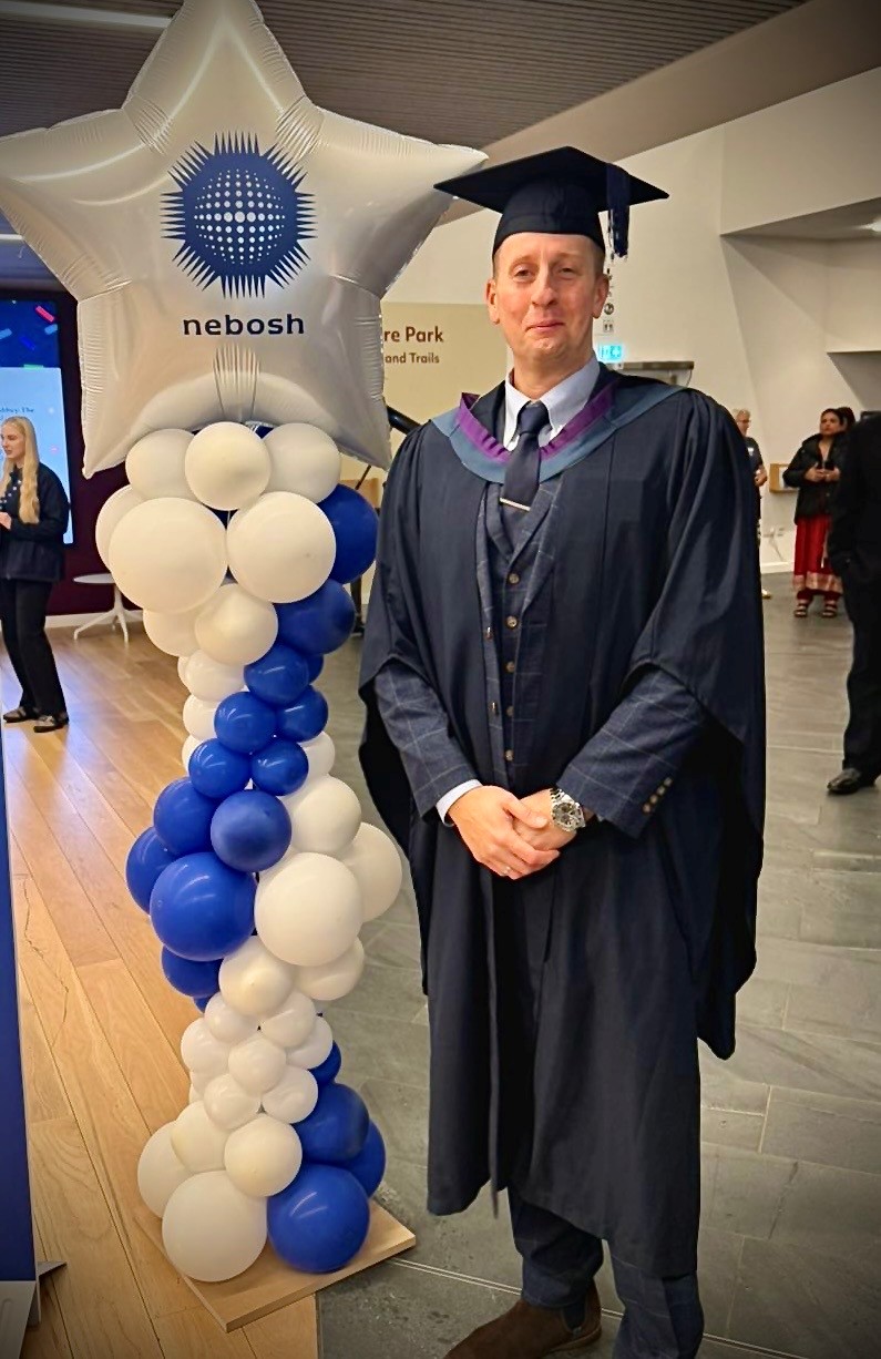 Graham Salter, Head of Health, Safety and Environmental Sustainability at the University of Kent, recently celebrated his achievement at the 2025 NEBOSH Graduation Ceremony.