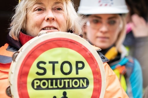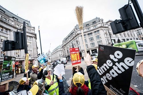 To the beat of Britney Spear’s Toxic, the Hollies’ The Air That I Breathe, Too Much Pollution by Natty Nation and many others, campaigners on a wet and windy morning repeatedly crossed Oxford Circus, shouting slogans, clanging dustbin lids and shovels, holding placards on high and distributed leaflets to the public. BBC London News and London Live were on site interviewing key spokespeople for the campaign, including Andrew Grieve, senior air quality analyst of King’s College London and British Safety Council’s head of campaigns, Matthew Holder.