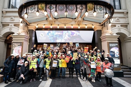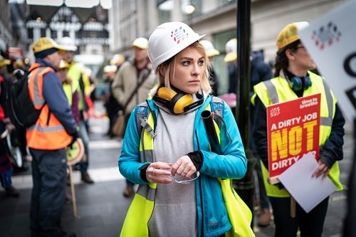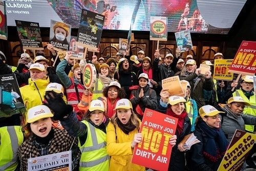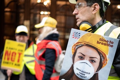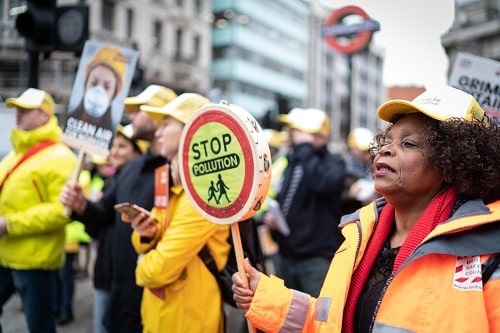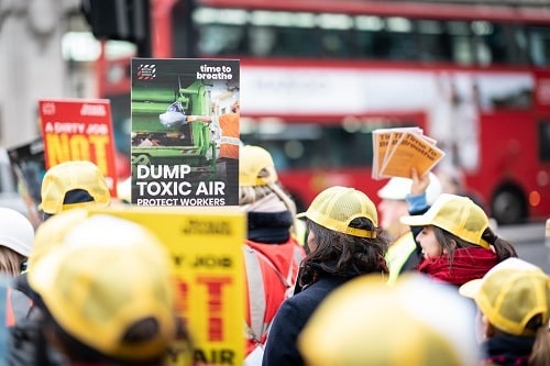 Over 50 participants, dressed as couriers, construction and road workers, police and lollipop ladies, came together to highlight the health risks outdoor workers face from long-term exposure to ambient air pollution.
