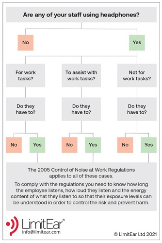 The flowchart on this page can help you decide how to take action to control the risk of hearing damage from workers using headphones, both for work tasks and personal reasons. It’s available at: bit.ly/3ky9rY4