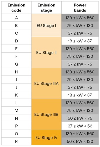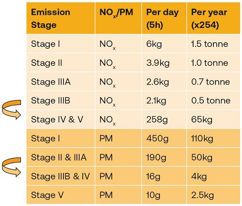 Although things can get technical quite quickly, simply put, engine emissions are set out in Emission Limit Values, which assign per kW of power produced, given amounts of NOx and PM. Tested engines are type-approved with a more simplified ‘Stage’ coding running from: I, II, IIIA, IIIB, IV and V, getting cleaner as we go. It’s not unlike the Euro 1–6 system for road-going vehicles. See the table below.