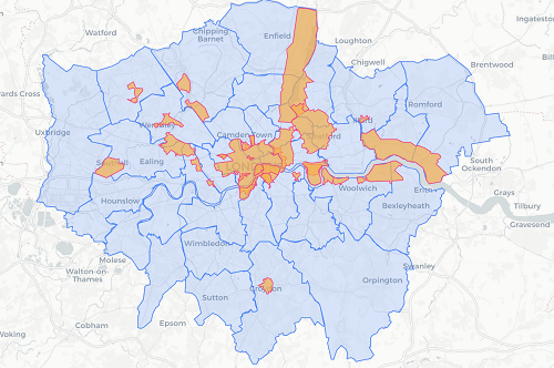 The London Construction Low Emission Zones. All of the London boroughs are included, with additionally enhanced requirements for those zones shaded orange. From 2025, all of London shall have the same requirement, of Stages IV and V. Map courtesy of: nrmm.london