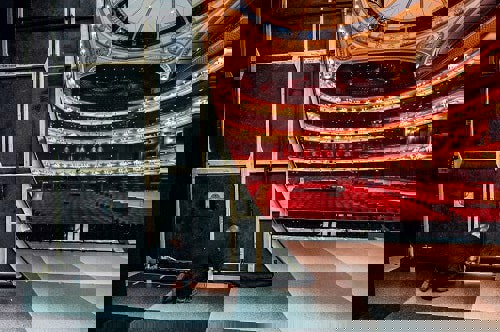 Our tour starts in the Grade I listed auditorium which seats 2,256 people in a horseshoe design. The red and gold interior is luxurious, like the inside of a jewellery box. One of the first surprising facts is that the ROH has twice burnt down in its history. The fires were in 1808 and 1856, and today, fire is still taken seriously as a risk.