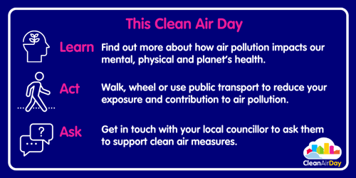 - Act: walk, wheel or use public transport to reduce your exposure and contribution to air pollution. If you drive, try leaving the car behind on Clean Air Day and one day every week