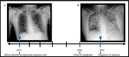Chest x-ray transition showing accelerated silicosis, with image (A) showing the chest X-ray 10 years prior and (B) the chest X-ray at the time of diagnosis. Photograph: From an article by Patino S, Izquierdo-Pretel G (July 05, 2022) A Case Report of Accelerated Pulmonary Silicosis