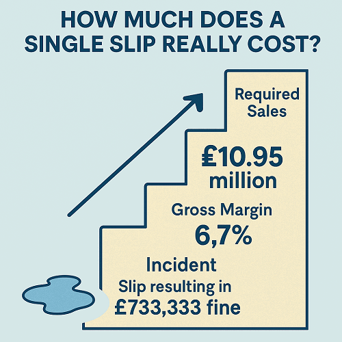 The consequences were devastating. Multiple hip fractures, surgery, constant pain and a life forever changed. But this wasn’t just a story of one man’s misfortune. This ‘simple slip’ resulted in a £733,333 criminal fine for Tesco. Yet here’s the kicker: £733,333 wasn’t the real cost to them. To make the money to pay that fine, Tesco needed to sell items to recoup that cost. With their gross margin of approximately 6.7 per cent, they needed £10,945,269 of sales to recover from just the fine alone.