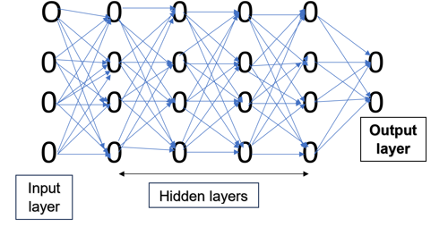 Figure 1: This figure shows an illustration of an artificial neural network involved in deep machine learning (DL). The interconnecting lines depict the connections between nodes and the complexities involved in signal communication.