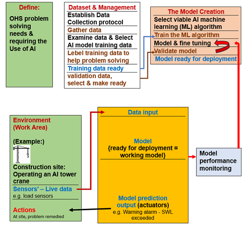 The block diagram in Figure 3 provides an overview of a typical AI model development and deployment, with OSH context in mind.