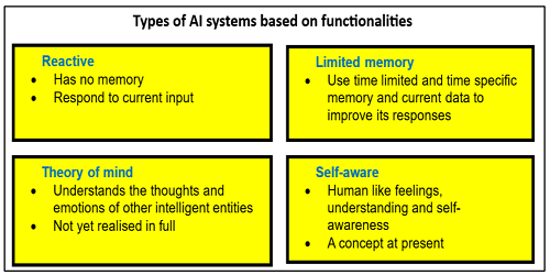 Like AI definition, AI technology is classified in several ways. Figures 4 and 5 summarise AI’s taxonomy based on capabilities and functionalities, respectively.